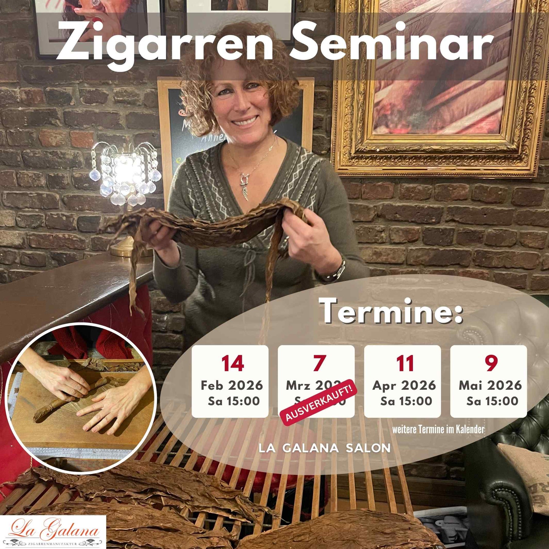 Lernen Sie im LA GALANA-Zigarrenseminar die traditionelle Handwerkskunst des Zigarrenrollens. Unser Seminar vermittelt fundiertes Wissen über die Geschichte der Tabakverarbeitung, von der Tabaksaat bis zur fertigen Zigarre. Sie erhalten praktische Einblicke in handwerkliche Fertigungstechniken und können Ihre eigene Zigarre unter professioneller Anleitung rollen.