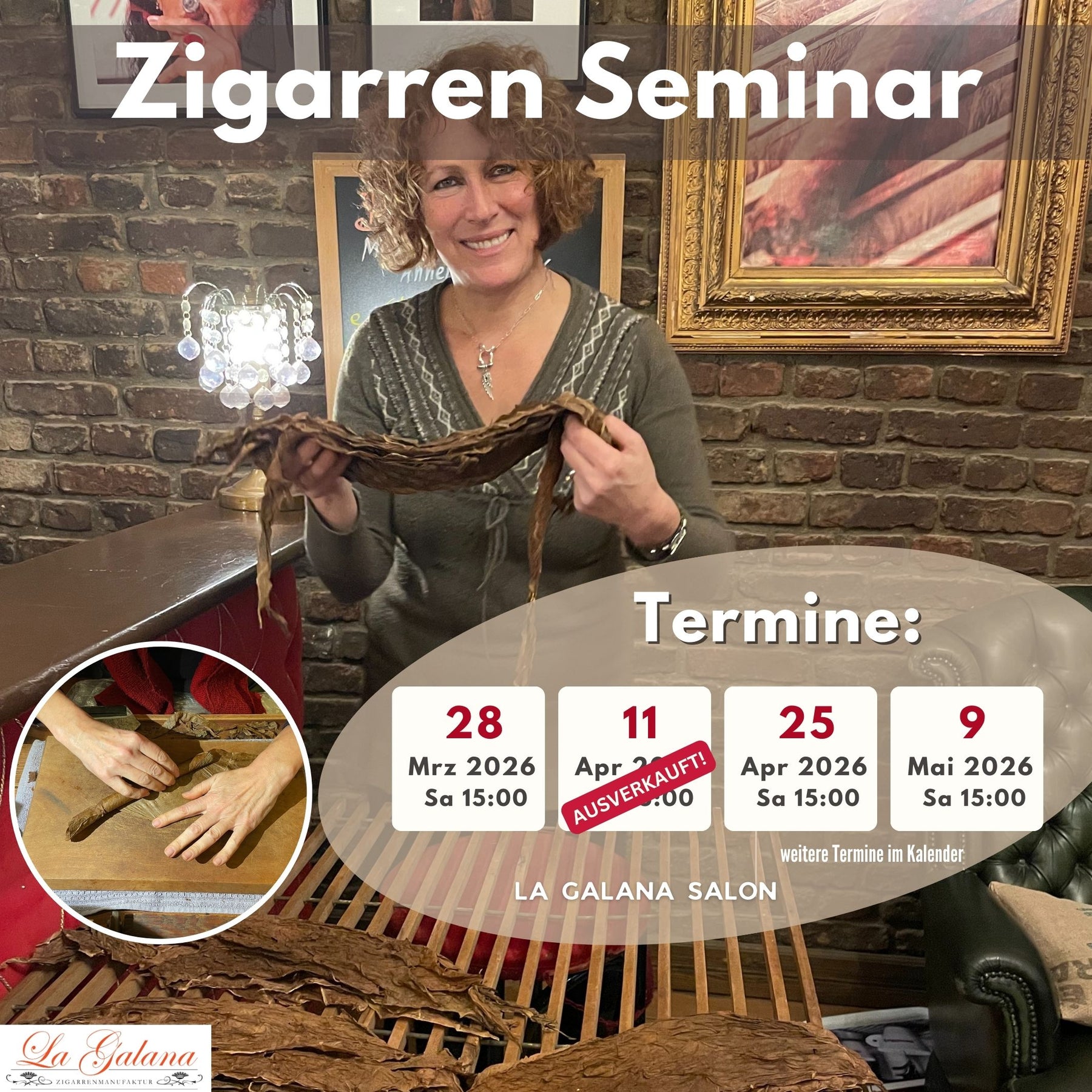 Lernen Sie im LA GALANA-Zigarrenseminar die traditionelle Handwerkskunst des Zigarrenrollens. Unser Seminar vermittelt fundiertes Wissen über die Geschichte der Tabakverarbeitung, von der Tabaksaat bis zur fertigen Zigarre. Sie erhalten praktische Einblicke in handwerkliche Fertigungstechniken und können Ihre eigene Zigarre unter professioneller Anleitung rollen.