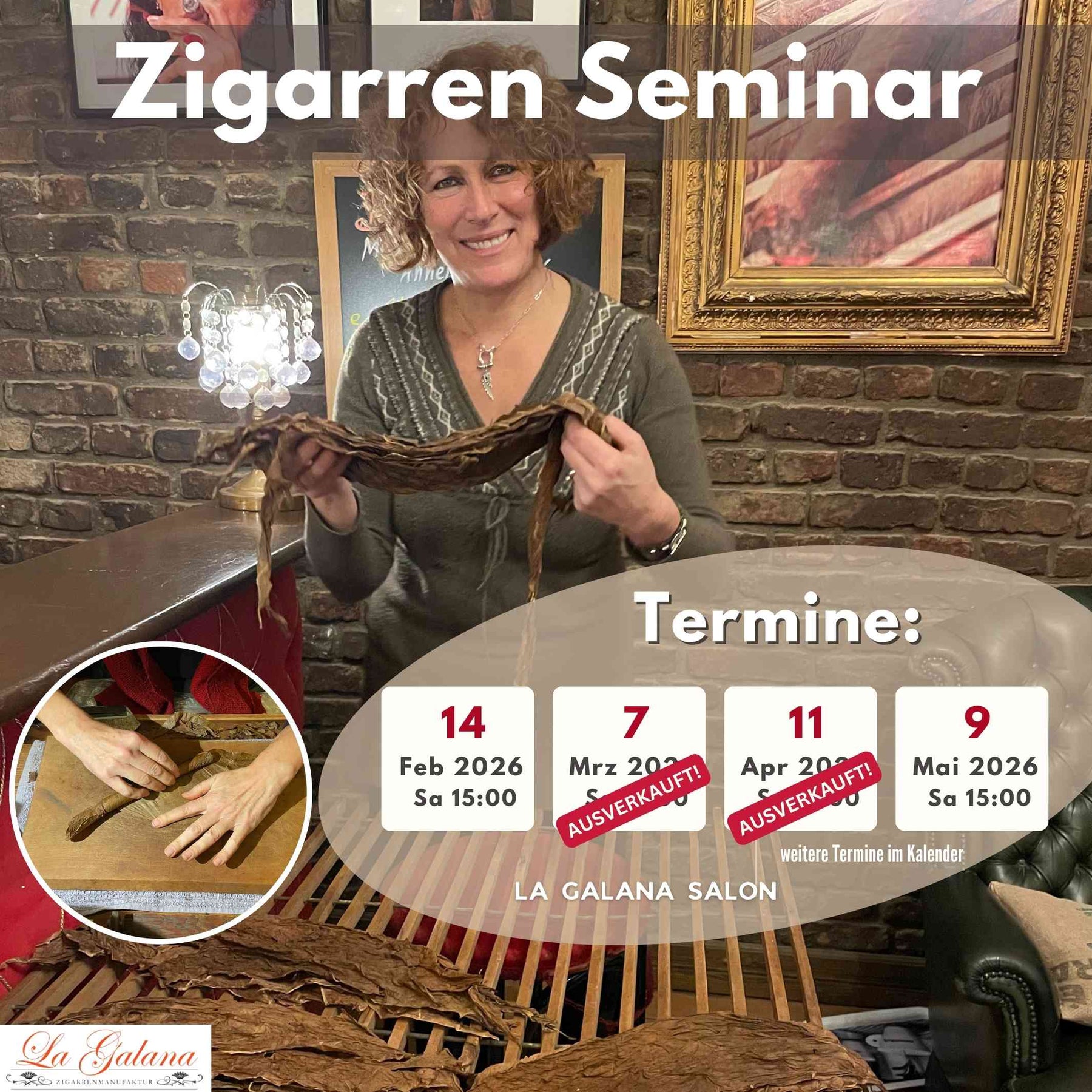 Lernen Sie im LA GALANA-Zigarrenseminar die traditionelle Handwerkskunst des Zigarrenrollens. Unser Seminar vermittelt fundiertes Wissen über die Geschichte der Tabakverarbeitung, von der Tabaksaat bis zur fertigen Zigarre. Sie erhalten praktische Einblicke in handwerkliche Fertigungstechniken und können Ihre eigene Zigarre unter professioneller Anleitung rollen.